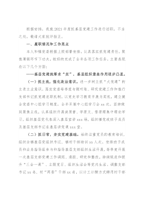 几个方面:——基层党建统筹求“实”,基层组织堡垒作用逐步凸显。(一)抓主线,强化政治意识。进一步树立抓“大党建”的主责主业意识。落实党委每季度专题听取、研究党建工作和推行支部书记抓党建述职机制。以党史学习教育开展为契机,建立健全党委中心组学习制度,全年开展中心组学习会xx次,坚持做到聚焦
