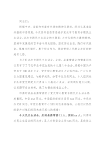 !今天民主生活会,应到县委常委11人,实到xx人。列席本次民主生活会的同志有:县人大常委会主任XXX同志、县政协主席XXX同志、县纪委机关、县委组织部、县党史学习教育办公室各有关同志。本次民主生活会共有五项议程:一是通报上一年度民主生活