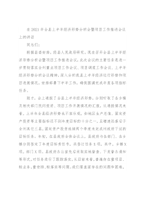 在2021年全县上半年经济形势分析会暨项目工作推进会议上的讲话同志们:根据县委安排,经县人民政府研究,现在召开全县上半年经济形势分析会暨项目工作推进会议,此次会议的主要任务是进一步贯彻落实全州重点项目工作会议、项目调度工作会议、上半年经济形势分析会议精神,深入分析我县上半年经济运行形势