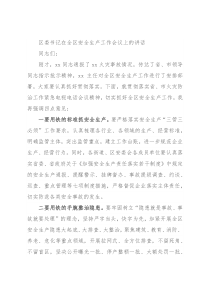 区委书记在全区安全生产工作会议上的讲话同志们:刚才,xx同志通报了xx火灾事故情况,传达了省、市领导同志指示批示精神,xx主任对全区安全生产工作进行了安排部署,大家要认真抓好贯彻落实。下面,就贯彻落实省、市火灾防治工作紧急电视电话会议精神,切实抓好全区安全生产工作,我再强调四点意见:一要用铁的标准