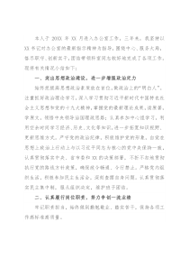 本人于20XX年XX月进入办公室工作,三年来,我坚持以XX书记对办公室的最新指示精神为指导,围绕中心、服务大局,恪尽职守、创新实干,团结带领科室同志较好地完成了各项工作。现将有关情况小结如下:一、突出思想政治建设,进一步增强政治定力始终把提高思