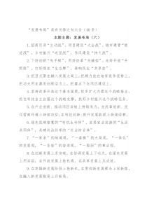 局观,“一体化”的发展观,“一条船”的奋进观,“一股劲”的事业观。8.在创新发展上求突破,在协调发展上下功夫,在绿色发展上用实招,在开放发展上抢机遇,在共享发展上见成效。9.在把握新发展阶段上抢新机,在贯彻新发展理念上闯新路,在融入新发展格局