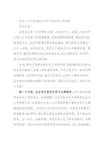 在区人大代表2021年学习培训班上的讲话各位代表:这是我们第三次齐聚到全国人大培训中心。全国人大培训中心是人大系统培训的最高殿堂,里面有最好的授课、最好的环境、最高的品位。我们对授课的要求越来越高,我们的培训质量也一次比一次好,
