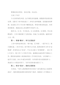 尊敬的各位领导、各位评委,同志们:大家上午好!今天身穿绿色外套,这个颜色亲切温暖,就像患者给我们的礼赞:无影灯下的“绿衣战士”。护佑生命和健康,是我最初的梦想,也是我工作X年以来不懈的追求。带着对事业的追求、对青春的展望,我鼓足信心来竞聘手术室护士长。我叫XX,XX岁,中共党员,XX文化