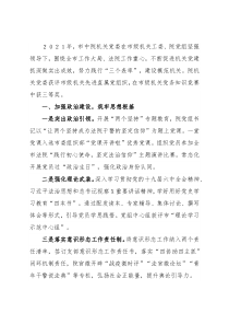 次,谈心谈话X人次,服务大项目X个,基层调研X次,深化打造党建品牌X个。三是积极参加疫情防控工作。成立战疫先锋队临时党支部,党员下沉高速卡口、基层社区,主动参与联防联控。发扬团结协助精神,向X援助医用口罩等防疫物资,携手抗疫。科信处支部日夜奋战,一周建成X家驻所支云科技法庭,充分发挥先锋模范