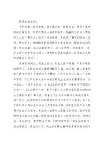 敬爱的党组织:光阴似箭,日月如梭。回首过去的一段时间里,通过上级党委的正确引导、支部及联系人的培养教育、周围同志的关心帮助和自身的不懈努力,接受了党的教育,系统地了解党的历史、性质、根本宗旨、组织制度和组织原则等基本知识,使我在政治思想上更加成熟。经过近期的学