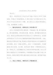 在全区征兵工作会上的讲话同志们:刚才,市政府征兵工作会对全市2021年征兵工作作了具体安排,并提出了详细的要求;X部长总结了去年我区征兵工作,并对今年征兵任务进行了部署。请大家务必认真抓好贯彻落实。下面,我再强调三点意见。一、强化政治站位,