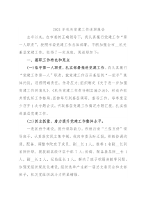 2021年机关党建工作述职报告去年以来,在市委的正确领导下,我认真履行党建工作“第一人职责”,按照市委党建工作总体部署,不断加强全市__机关基层党建工作,取得了一定成效。现述职如下:一、履职工作特色和亮点(一)恪守第一人职责,扎实部署推