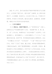 公司安全底线,未发生责任原因安全差错等级以上事件。二是落实疫情防控主体责任,成立了临时党支部,建立协同工作机制;争取疫情防控物资资源,筹集物资**件,价值约**万元;压实“四方责任”,签订责任书,开展核酸检测**次、**万人次。实现了员工零感染、旅