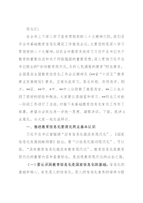 又对前一阶段工作进行了总结,对接下来基础教育信息化有关工作作了部署,希望与会同志进一步统一思想、凝聚共识。下面,我讲4点意见,与大家一起交流研讨。一、推进教育信息化要深化两点基本认识习近平总书记曾强调“没有信息化就没有现代化”。《国家信息化发展战略纲要》指出