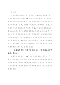 同志们:今天,我们*名同志,用1天时间,从**到**,途经8个村,对全市党建引领乡村振兴“**”试点三年行动开展了第1次拉练,主要任务是拉练评比打擂台、比学赶超促提升。比的是各试点村半年来的变量、成效;比的是各