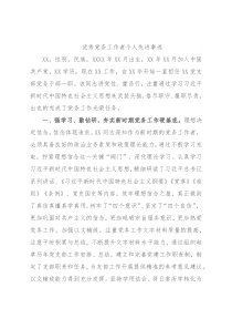 色社会主义思想来武装头脑,恪尽职守、履职尽责,出色的完成了党务工作光荣任务。一、强学习、勤钻研,夯实新时期党务工作硬基底。理想决定信念,信念体现追求。XX同志深知作为新时期的党务工作者,必须具备良好的政治业务素质和政策理论能力,通过不断学习充电,拧紧理想信念这一关键“