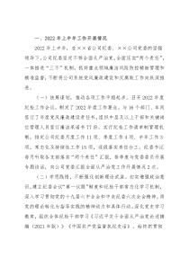 一、2022年上半年工作开展情况2022年上半年,在××省公司纪委、××公司党委的坚强领导下,公司纪委坚定不移全面从严治党,全面压实“两个责任”,一体推进“三不”机制,抓好重点领域廉洁风险防控精细管理和精准监督,不断将公司系统党风廉政建设和反腐败工作向纵深推进。(一)统筹谋