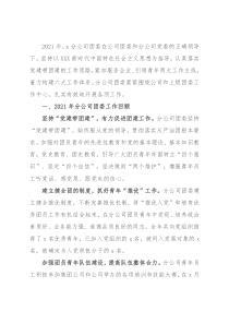2021年,x分公司团委在公司团委和分公司党委的正确领导下,坚持以XXX新时代中国特色社会主义思想为指导,认真落实党建带团建的工作思路,紧扣服务企业、引领青年两大工作主线,着力构建六大工作体系。分公司团委紧紧围