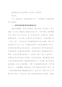 县教体局长在全县教育工作会议上的讲话同志们:今天,借此机会,我就当前和今后一个时期的工作简单的再讲几点意见。一、始终保持创新进取的精神状态目前正值暑假,师生已经离校,相对来说,任务减少,压力减轻。可以说,暑假也正是我们总结工作,分析问题,查