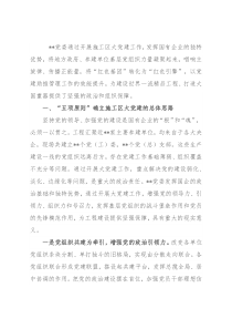 流精品工程、打造大国重器提供了坚强的政治和组织保障。一、“五项原则”确立施工区大党建的总体思路坚持党的领导、加强党的建设是国有企业的“根”和“魂”,必须一以贯之。工程汇聚近**家主要参建单位,均来自于各大央企