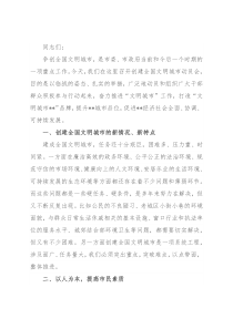 同志们:争创全国文明城市,是市委、市政府当前和今后一个时期的一项重点工作。今天,我们在这里召开创建全国文明城市动员会,目的是以临战的姿态、扎实的举措,广泛地动员和组织广大干部群众积极参与行动起来,奋力推进“文明城市”工作,打造“文明城市**”品牌,提