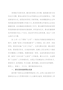 效、守正创新、提质增效,切实肩负起举旗帜、聚民心、育新人、兴文化、展形象的使命任务。一、深化党的创新理论武装新形势下国有企业党建思想宣传工作,必须以XXX新时代中国特色社会主义思想和党的十九大精神为指导,特别是要深入学习领会和把握XXX关于思想宣传工作有关论述的重