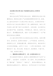 在县委办党支部2022年度组织生活会上的讲话同志们:组织生活会是严肃党内政治生活、增强党的生机活力的重要法宝,是落实全面从严治党战略部署的具体行动。前面,办公室党支部召开了支委会和党小组会议,支部委员和每一名党员对自己存在的问题