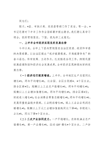 同志们:刚才,*县、市统计局、发改委等部门作了发言,等一会,*书记还要对下半年工作作全面部署并提出要求,我们要认真学习领会,抓好贯彻落实。下面,我先讲三点意见:一、上半年全市经济实现良好发展态势今年以来,全市上下坚决贯彻
