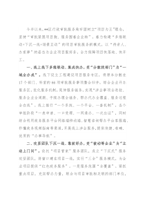 项目,充实帮办力量,联合与项目审批相关联的部门单位,全面实施提前介入、同步推进、即时服务等“一线工作”措施,服务项目变“一对多”“一对一”为“多对一”,提升专属服务体验,确保高质解决问题,高效办理手续。二是服务环节“全流程”
