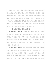 2022年市外办机关党建工作总的要求是:以XXX新时代中国特色社会主义思想为指导,认真学习贯彻党的XX届X中X会精神和省市党代会及机关党建工作会议精神,以抓实“七张问题清单”为关键,以纵深推进“双创双建”大提升行动为牵引,深入实施“红色根脉强基工程”,持续推动机关党