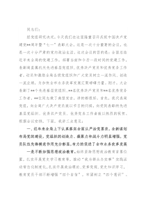 。首先,我代表局党组,向全局广大共产党员致以节日的问候,向受到表彰的先进基层党组织、优秀共产党员、优秀党务工作者致以热烈的祝贺。根据会议安排,下面,我讲三点意见:一、近年来全局上下认真落实全面从严治党要求,全新谋划布局党的建设,党组织的创造力、凝聚力和战斗力明显