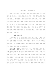 X市选调生工作调研报告选调生工作是党中央着眼干部队伍长远发展实施的一项战略举措。近年来,X市认真抓好《关于进一步加强和改进选调生工作的意见》贯彻落实,选调生工作取得新的进展。为深入贯彻习近平总书记重要
