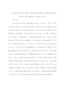 开展情况,纠正偏差,确保在交流互鉴中提升认识、升华思想,感悟初心、牢记使命,在联系实际中破解难题、改进作风。同志们,百年征程波澜壮阔,初心使命历久弥坚。我们要更加紧密地团结在以习近平同志为核心的党中央周围,坚持以习近平新时代中国特色社会主义思想为指导,以强烈的政治自觉、务