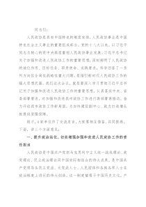 工作的新担当新作为。二要在领悟伟大思想中把稳前进方向。习近平总书记关于加强和改进人民政协工作的重要思想,是习近平新时代中国特色社会主义思想的重要组成部分,是指引新时代人民政协工作的强大思想武器。我们做好新时代人民政协工作,必须深入学习贯彻这一伟大思