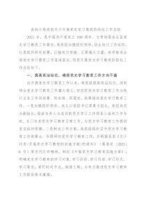 县统计局党组关于开展党史学习教育阶段性工作总结2021年,是中国共产党成立100周年。为贯彻落实全县党史学习教育工作要求,局党组加强组织领导,结合统计工作实际,认真组织研究部署,以强有力举措、汇聚强大力量,有序推进全局党史学习教育工作落地落实。现将开展党史学习教育阶段性工作总结如下。一、提高政治