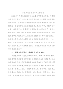 乡镇新任公务员个人工作总结2020年7月我从XX医学院公共事业管理专业毕业,并通过公务员考试成为了一名乡镇公务人员。作为一个刚刚走出大学校门的大学生,没有任何工作经验的我对于如何做好行政工作,如何做好一名合格的公务员感觉很