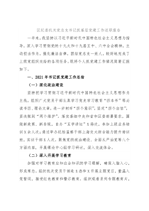 区纪委机关党总支书记抓基层党建工作述职报告一年来,我坚持以习近平新时代中国特色社会主义思想为指导,深入学习贯彻党的十九大和十九届五中、六中全会精神,主动担当作为,强化廉洁自律,团结党总支一班人,较好地完成了上级党组织交给的各项任务。现将个人抓党建工作