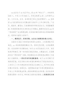 了社区消防安全管理难度。在找准问题、摸清底子后,xx街道第一时间出台《xx街道xx社区居住出租房、火灾隐患集中区域整治工作实施方案》,xx社区立即组织召开党员大会、村民代表大会、妇联会议、乡贤会议等,完善《社区公约》内消防安全管理要求,广泛宣传、迅速动员、全员压