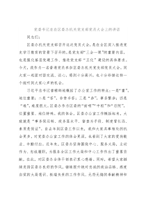 党委书记在在区委办机关党支部党员大会上的讲话同志们:区委办机关党支部召开这次党员大会,是在全区深入推进党史学习教育的背景下召开的,是党支部“三会一课”的重要内容,也是强化基层党建工作、推进党支部“五化”建设的具体要求。今天,我作为一名普通党员参加区委办机关党支部党员大