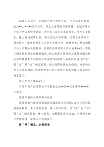 **是人多地少、资源贫乏的平原农业县,位于**省东南部,地处**、*与**三市交界,历史上曾经是交通闭塞、县域发展水平低下的国家级贫困县。近年来,**立足本县实际,坚持工业强县,强力推进招商引资,倾力优化