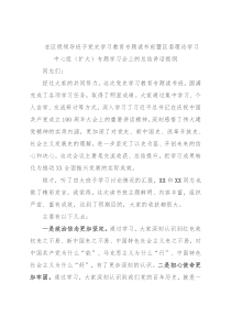 ,不是终点。在接下来的学习和工作中,大家要以本次专题读书班为契机,大兴学习之风、大兴调研之风、大兴落实之风,以学习研讨的实际成效推动我区各项工作全面提升、全面进步。下面,就继续推动习近平总书记重要讲话精神贯彻落实和党史学习教育走深走实,我再强调四点意见。一要提高政治站位“学党史”,切实做到学深悟