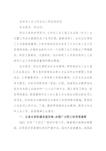 在市总工会工作会议上的总结讲话各位委员、同志们:经过大家的共同努力,X市总工会X届X次全委(扩大)会议暨工作会议圆满完成了各项议程,就要结束了。这次会议得到了X市委高度重视,X的书面讲话充分肯定了X年以来工会工作取