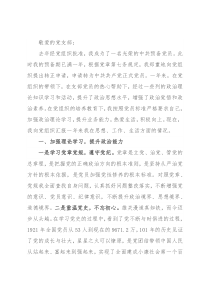 加坚定理想信念,牢固树立正确的世界观、人生观、价值观;重温党史,让我明白要始终保持清醒头脑,鞭策自己矢志不渝地跟党走。三是积极主动参加支部活动。一年来,我积极参加支部组织会议,记录好会议会议记录,认真温习;主动参加支部组织的各种活动,