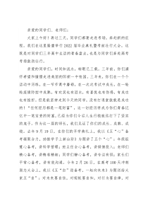 亲爱的同学们、老师们:大家上午好!再过三天,同学们都要走进考场,奔赴新的征程。我们在这里隆重举行2022届毕业典礼暨考前壮行大会,这既是对同学们三年高中生活的青春盘点,也是为同学们奔赴高考考场鼓劲壮行。亲爱的同学们,时间如流水,转眼已三载。三年前,你们满怀希望和