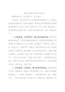 ,努力跑好*公安薪火相传、驰而不息的接力赛。为此,我表态如下:一、忠诚赤诚。公安局局长,最大的本钱是忠诚。组织任命就是我的使命,公安职业就是我的事业。我将坚决贯彻落实习近平新时代中国特色社会主义思想,忠实践行