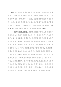 性收入增长在**%以上,****年全市村集体经济组织经营性收入增长**.*%,全面消除了薄弱村,集体经济强村占比**%。一、党建引领作用明显。坚持基层党组织特别是村级党组织在发展壮大村级集体经济中的主导作用,要充分发挥广大党员的聪明才智,建言献策,群策群力,坚持