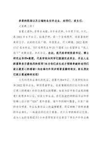 观看直播的校友、家长朋友们致以最诚挚的欢迎!今天利用毕业典礼的机会,我要代表*书记、代表学校向全体2022届毕业生,特别是留学生,在疫情期间的付出与担当表示衷心的感谢!向你们表现出的理解、包容与坚守表示由衷的敬意!我想多年以后,回首大学生活,你们抗疫的种种经历会和学校精心设计的“520”