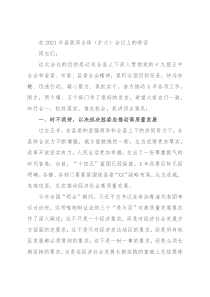 在2021年县政府全体(扩大)会议上的讲话同志们:这次会议的目的是动员全县上下深入贯彻党的十九届五中全会和省委、市委、县委全会精神,紧盯全面目标任务,快马加鞭、迅速行动,凝心聚力、真抓实干,奋力推动X年各项工