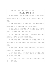,招商领域要全面,招商重点要突出,招商引智要同步,招商项目要策划,招商对接要专业,招商服务要到位。6.开启高规格、高频次、高标准的真诚交流,深化全方位、全地域、全天候的精诚合作。7.抓项目就是抓发展,抓项目就要善谋划,抓项目重在促落实,抓项目必须优服务。8.一个节点一个节点坚守,一个问题一个