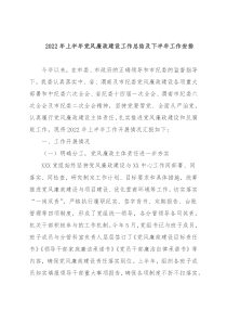的作风还需进一步改变。三、下半年工作措施2022年是党的二十大召开之年,要紧紧围绕这一主线,将全面从严治党工作和党风廉政建设工作与推进党史学习教育常态化长效化、推动XX工作高质量发展同谋划、同部署、同推进、同考核,强化责任意识,狠抓工作落实,确保全