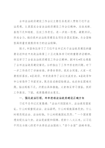 落细,为全面转型高质量发展提供有力的法治保障。刚才,书面传达学习了习近平总书记关于法治政府建设的重要论述和在中央政治局第三十五次集体学习时的重要讲话精神。传达学习了全省法治政府建设工作会议精神。副市长*同志通报了全市法治政府建设情况,分析指出了工作中存在