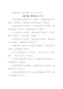 全局解决“难点”,聚焦关键疏通“堵点”,回应关切去除“痛点”。17.履行使命的“主阵地”,提升能力的“磨刀石”,实现价值的“大舞台”。18.巡视监督“政治体检”,审计监督“经济体检”,日常监督“廉洁体检”。19.新兴产业“主引擎”,传统产业“主力军”,园区载体“主阵地”作用。20.经济工作的“重