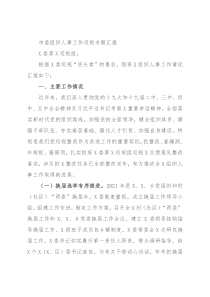 市委组织人事工作巡视专题汇报X委第X巡视组:根据X委巡视“回头看”的要求,现将X组织人事工作情况汇报如下:一、主要工作情况近年来,我们深入贯彻党的十九大和十九届二中、三中、四中、五中全会精神及习近平总书记考察X重要讲话精神,全面落实新时代党的组织路线,加强党的全面领导,健全组织体系、