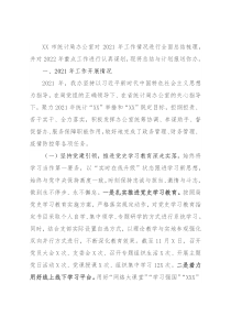 XX市统计局办公室对2021年工作情况进行全面总结梳理,并对2022年重点工作进行认真谋划,现将总结与计划报送你办。一、2021年工作开展情况2021年,我办坚持以习近平新时代中国特色社会主义思想为指导,在局党组的正